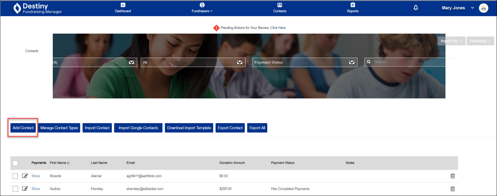 You can add a contact manually or import contacts using a template or from Google Contacts. Once a contact is added, you can edit or delete it.