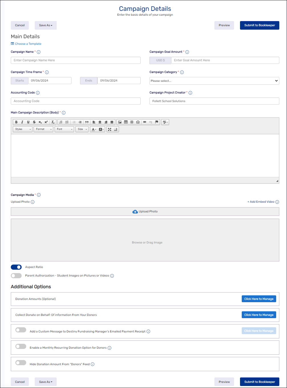 To submit your campaign for approval, click Submit to Bookkeeper. The bookkeeper will enter the accounting code and submit the campaign for district/school approval.