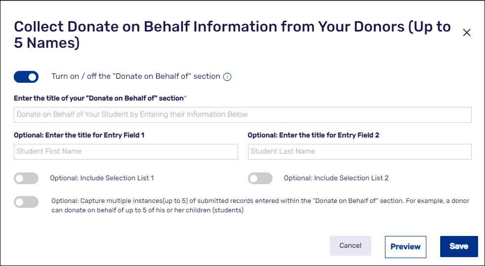 a. Turn on the Donate on Behalf of toggle. b. Enter a title for this section. c. Enter a title for Entry Field 1, such as Student First Name (optional). d. Enter a title for Entry Field 2, such as Student Last Name (optional). e. To include Selection List 1 and/or Selection List 2, turn on the toggle and fill in the fields. For example, you can add a list of homerooms for donors to select from (optional). f. To let donors indicate up to five names, turn on the multiple instances toggle. For example, someone might want to donate on behalf of their children. g. Click Preview to see how this section will appear. h. Click Save. |