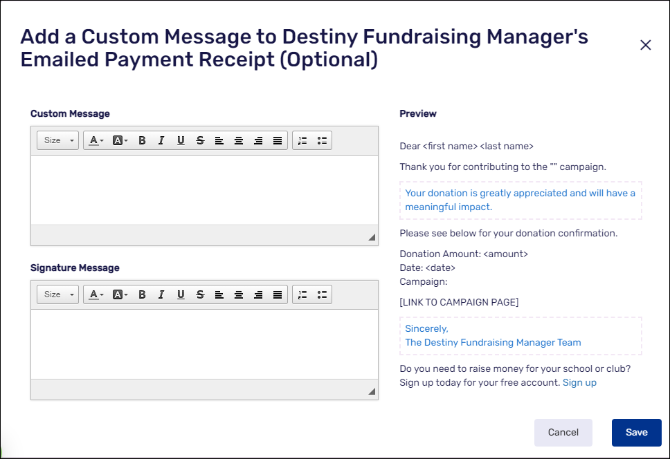 a. Turn on the toggle to Add a Custom Message to Destiny Fundraising Manager’s Emailed Payment Receipt. b. Click Click Here to Manage. c. Enter your custom message and signature message. Notes:
