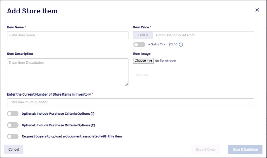• To add more items, click Save & Continue. Repeat these steps until all items are added.