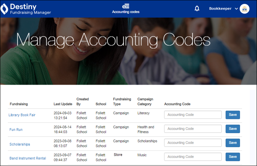 As part of the approval process, all fundraisers are sent to the bookkeeper to ensure the proper accounting code is entered. Accounting codes are determined by the school or district.
