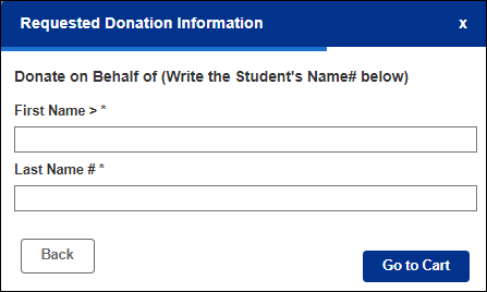 Click the Give Now button and follow the steps that appear. You will come to the 'Donate on Behalf of' section. Type in the student's First Name and Last Name.
