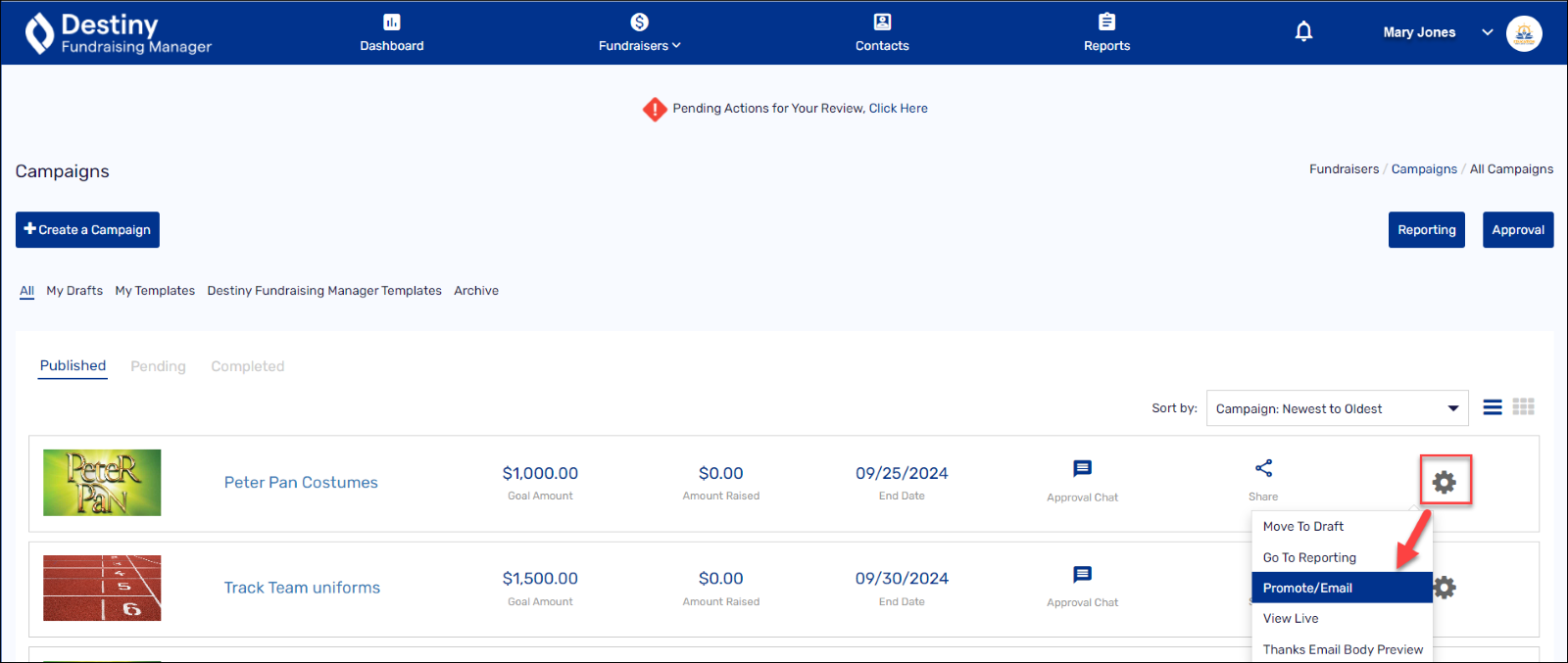- In the row of the campaign you want to work with, select the gear icon >Promote/Email.