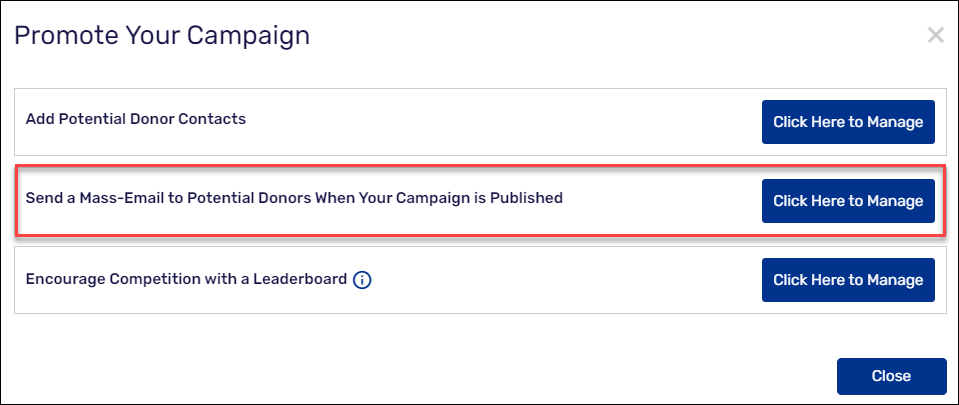 - A pop-up appears. At Send a Mass E-Mail to Potential Donors When Your Campaign is Published, click Click Here to Manage.