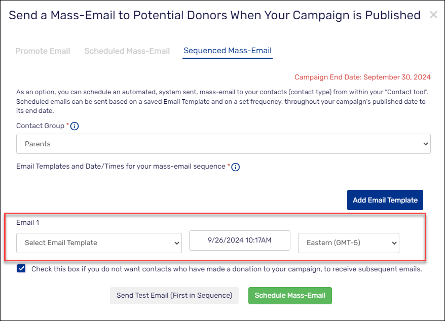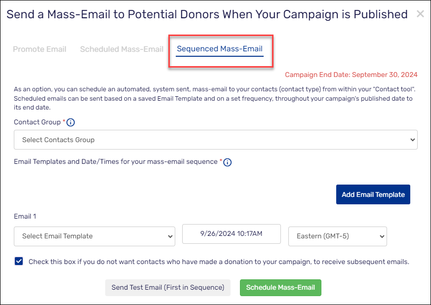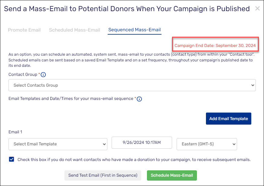 The last field, Check this box if you do not want contacts who have donated to your campaign to receive scheduled emails, is selected by default. Deselect the checkbox if desired.