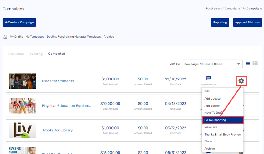 2. Next to the campaign you want, click the gear icon, then click Go To Reporting.