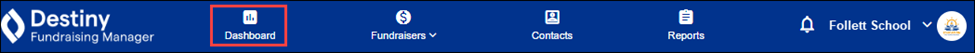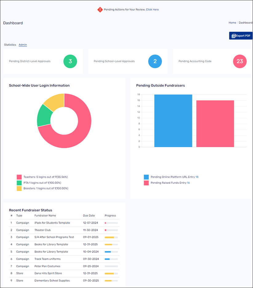 - The Admin tab includes the number of pending approvals at each approval level and graphs showing school-level login information, pending outside fundraising requests, and Recent Fundraiser Status.