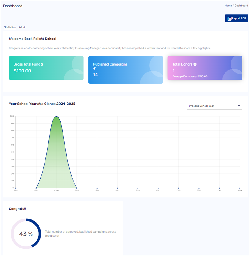 - The Statistics tab includes Gross Total Funds raised, number of published campaigns, and total number of donors, as well as graphs showing the amount raised by month and percentage of campaigns approved.